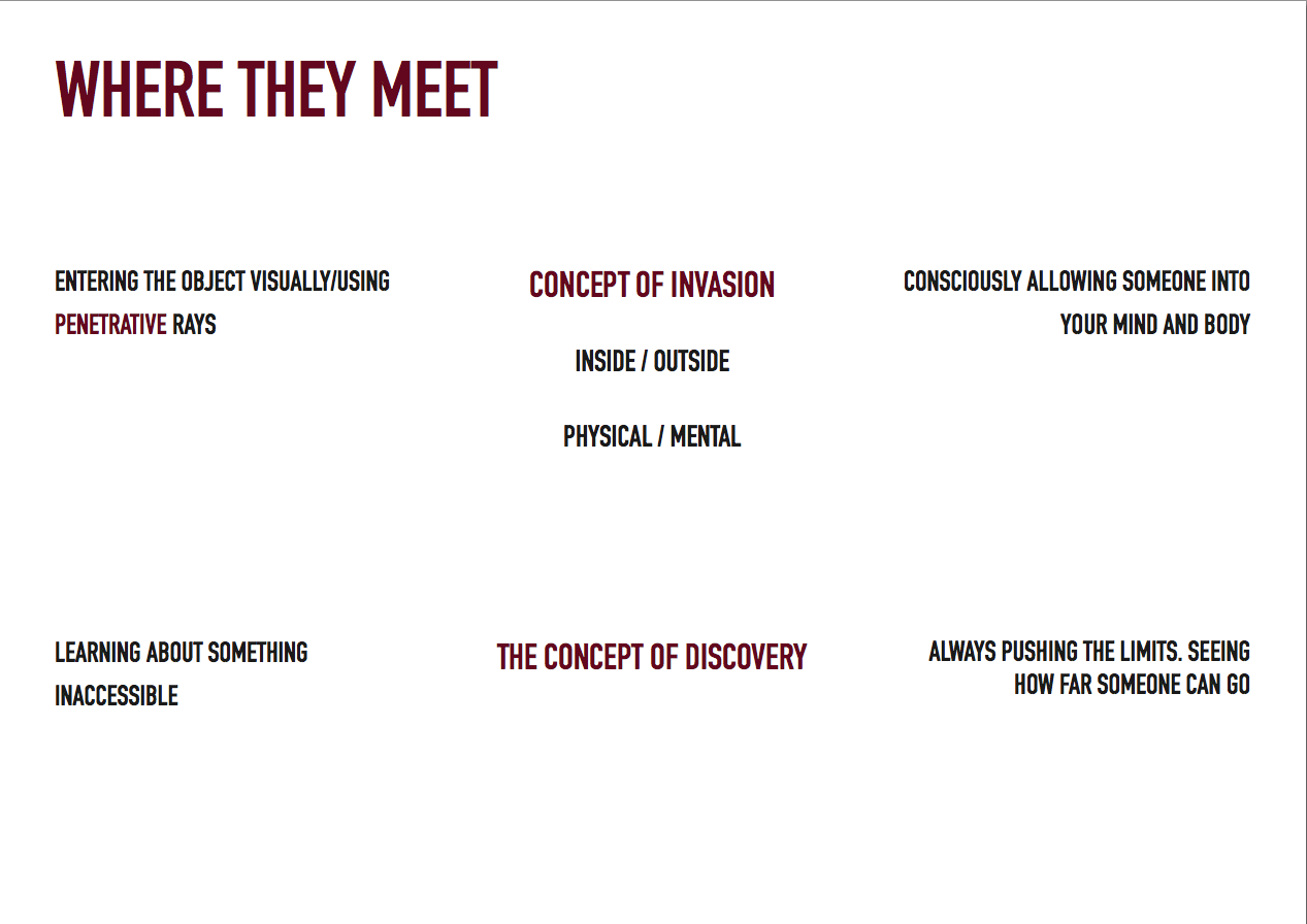 It's this idea of 'boundaries' that seems to be linking masochism and tomography quite well. In this instance the skin acts as a 'boundary' between the insides and out sides of the body, the visible and the invisible. In terms of masochism, the idea of a boundaries is more conceptual and relates more to master/slave dichotomy.